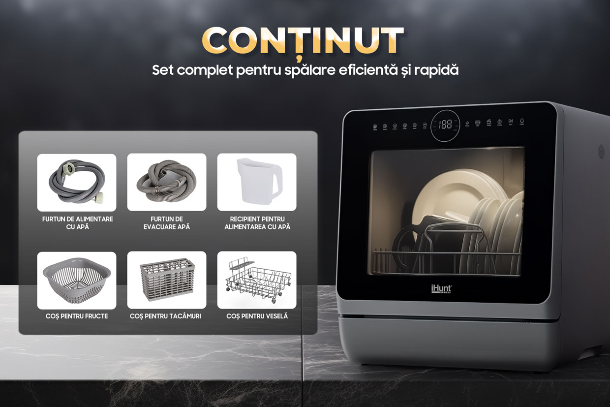 | Accesorii incluse | Cos Recipient Sertar tacamuri 1 Furtun alimentare la reteaua de apa 1 Furtun evacuare apa |