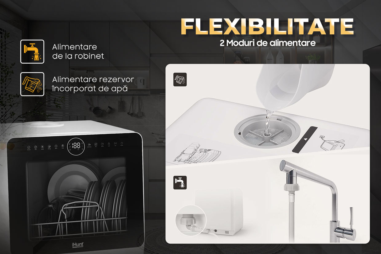- ✔ Doua moduri de alimentare: direct la robinet sau din rezervorul propriu.