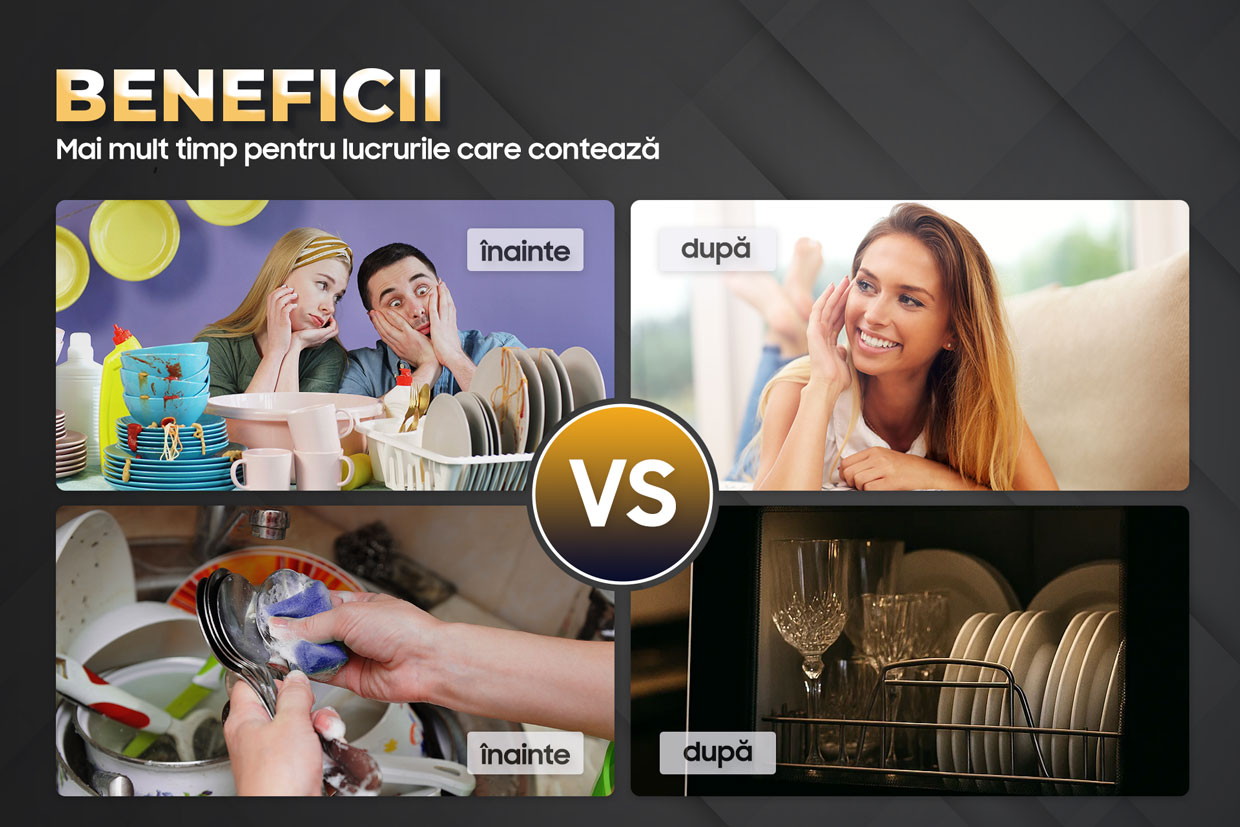 - Cheltuiesti mai putina apa si energie decat la spalatul manual.