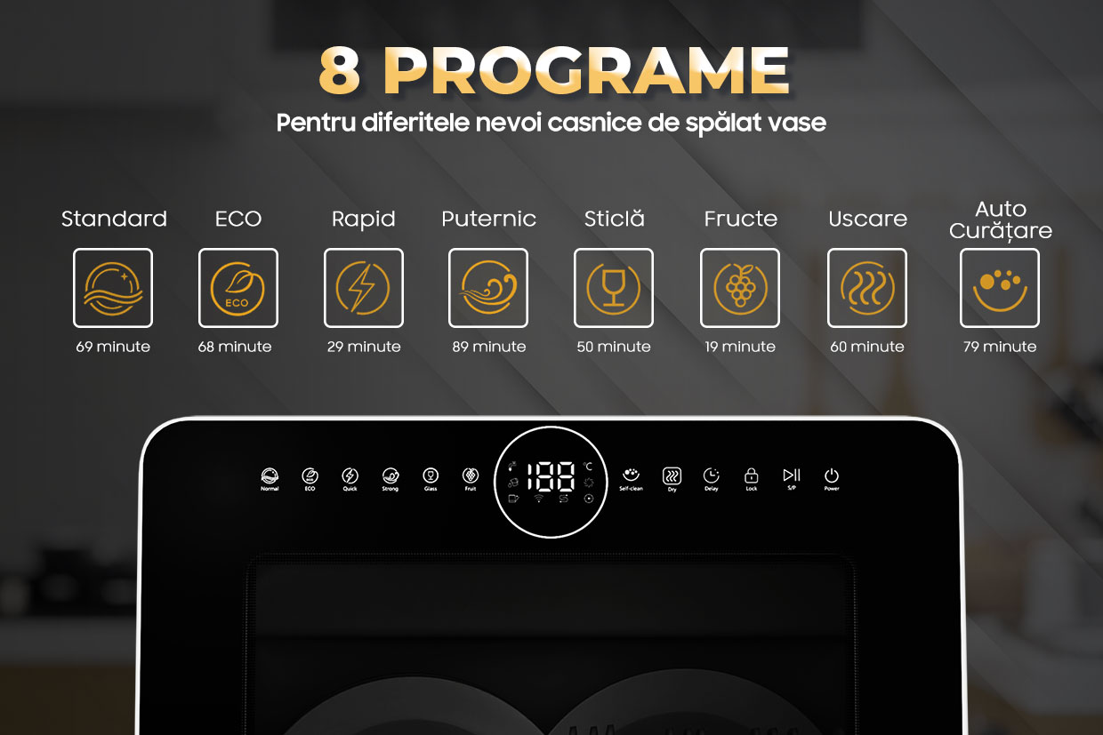 - ✔ Functie de uscare si antibacteriana – vasele ies curate si igienizate.