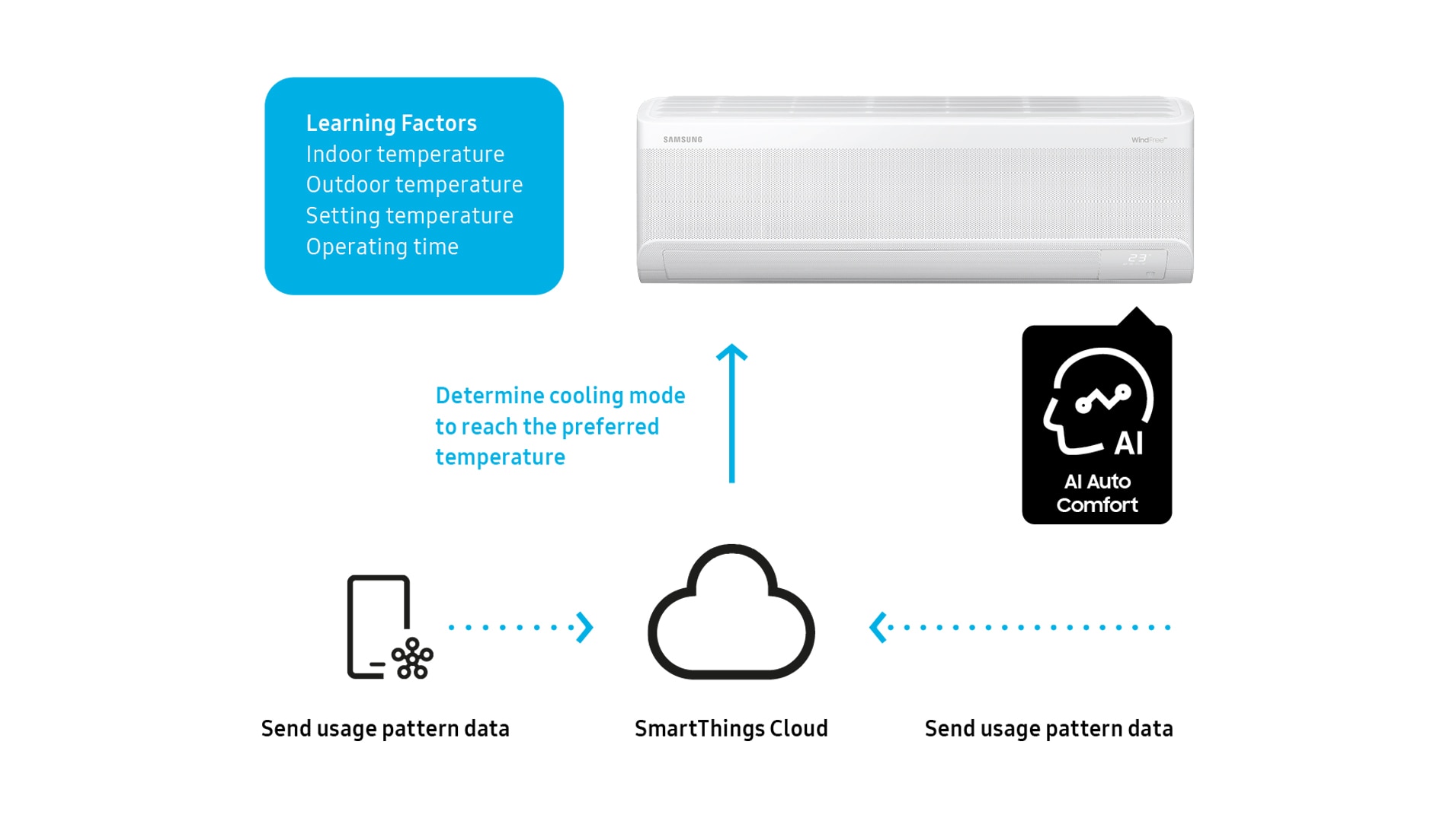 AI Auto Comfort (Confort automat prin intermediul inteligentei artificiale)2 va prezinta un mod de viata inteligent. Analizeaza mediul dumneavoastra ambiant si obiceiurile de utilizare3, si apoi ajusteaza automat temperatura. Temperaturile pot fi de asemenea gestionate de la distanta utilizand aplicatia SmartThings2. Pornirea si oprirea, selectarea modului de racire, programarea functionarii sau monitorizarea consumului de energie al aparatului dumneavoastra de aer conditionat sunt posibile printr-o simpla atingere.