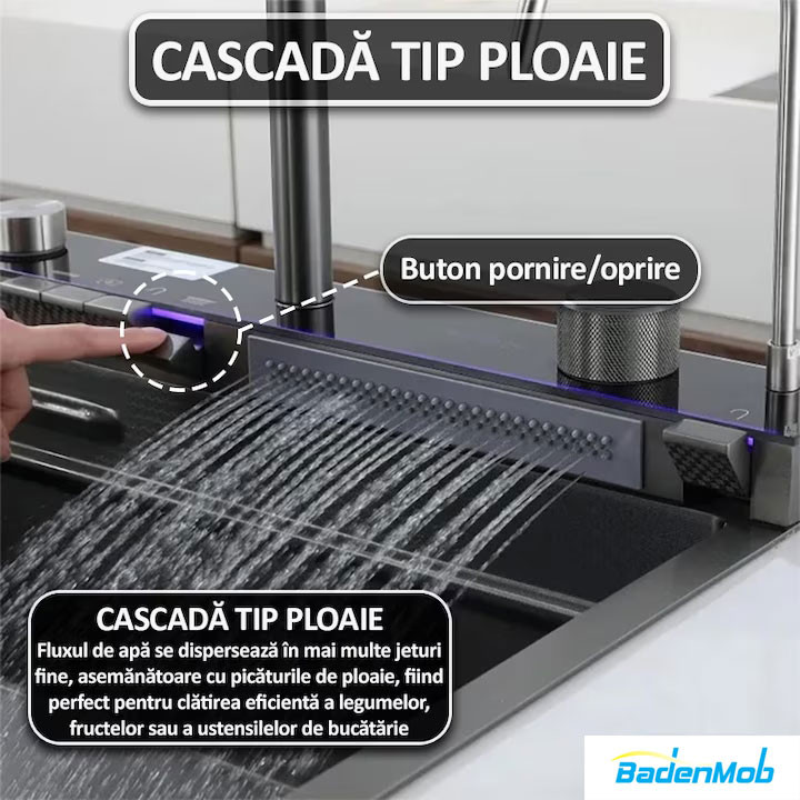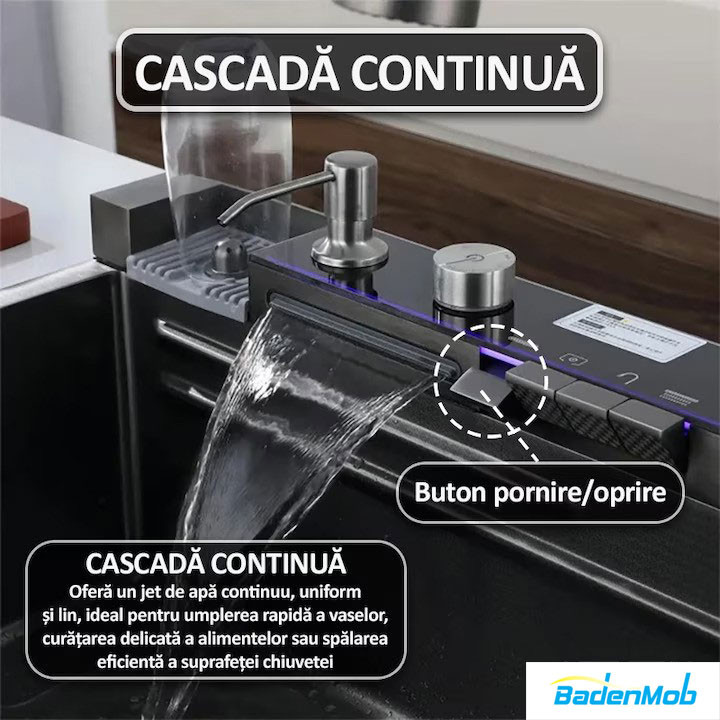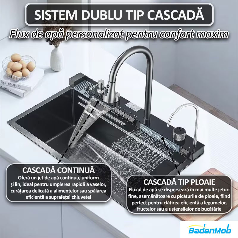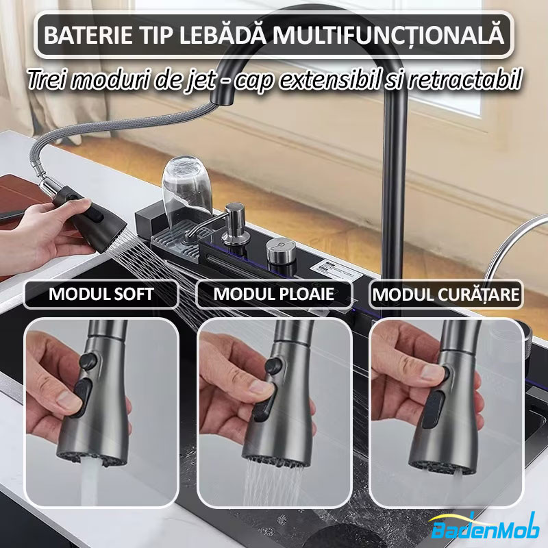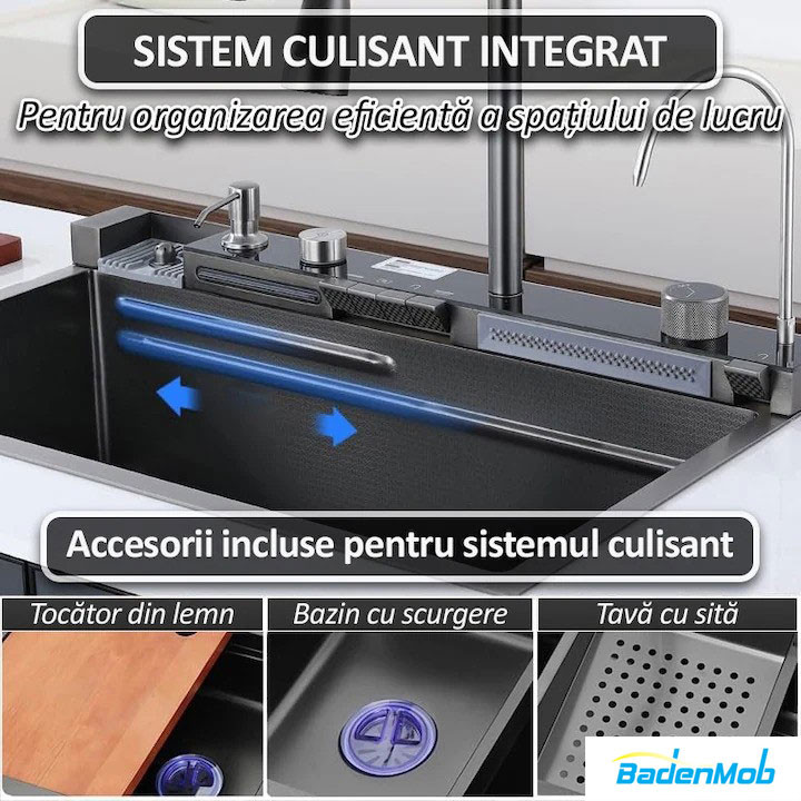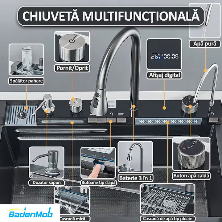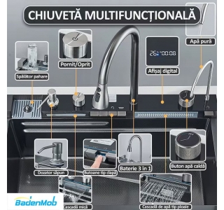 Set chiuveta multifunctionala smart, inox, BadenMob, afisaj digital, doua cascade, iluminare, spalator pahare, dozator detergent, baterie, anti zgarieturi, preaplin, 75X45cm