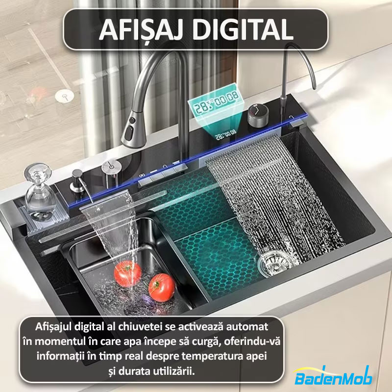 Transforma-ti bucataria intr-un spatiu modern si inteligent cu o chiuveta smart dotata cu afisaj digital, care iti arata in timp real temperatura apei si timpul de utilizare.