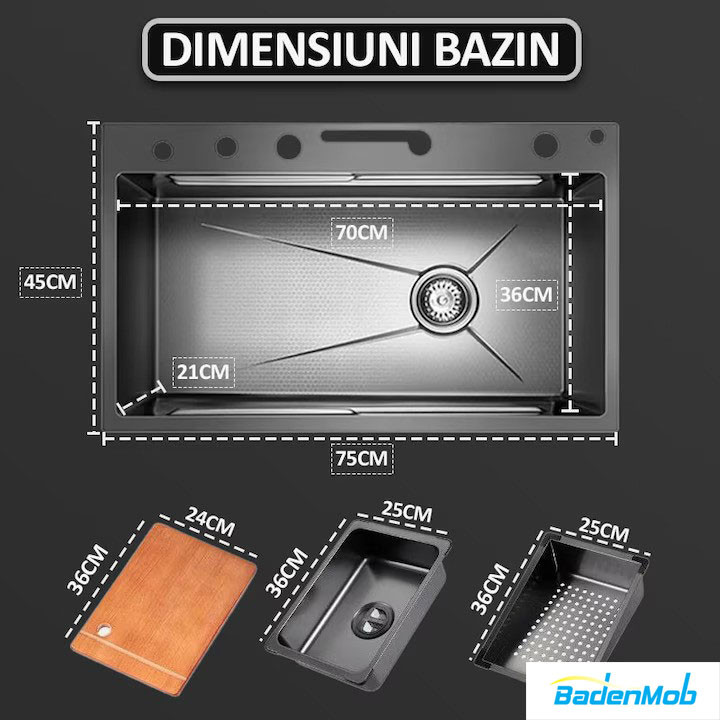 Dimensiuni exterioare: 75 45 cm, cu o adancime de 22 cm - se integreaza perfect in blatul de bucatarie, oferind un aspect modern si elegant.