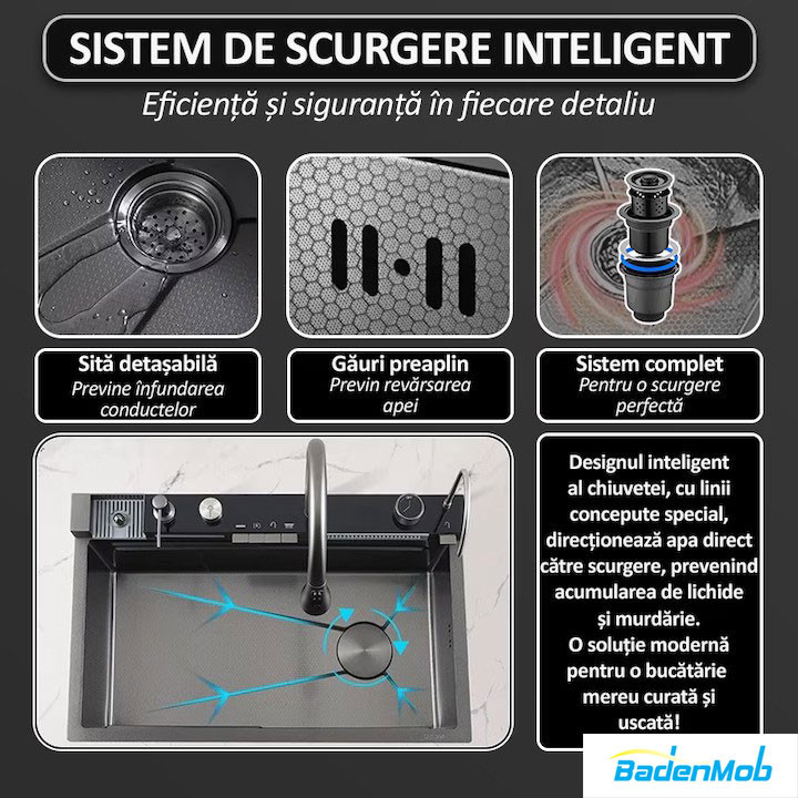 Chiuveta smart este echipata cu un sistem de scurgere inteligent, conceput pentru a asigura drenaj rapid si eficient, eliminand riscul acumularii apei si al blocajelor.