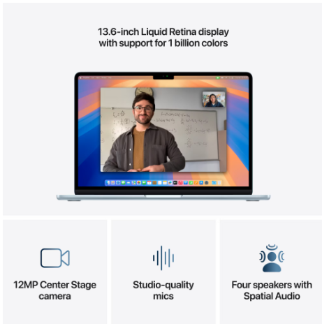 MacBook Air cu cipul M4 iti permite sa treci cu viteza prin tot ce ai de facut, oferind o autonomie a bateriei de pana la 18 ore.1 Este creat pentru Apple Intelligence pentru a te ajuta sa rezolvi tot ce ai de facut, fara efort. Iar acum se prezinta intr-o noua culoare de senzatie: Cer albastru. Cu MacBook Air perfect portabil, vei fi gata sa faci practic orice, oriunde.