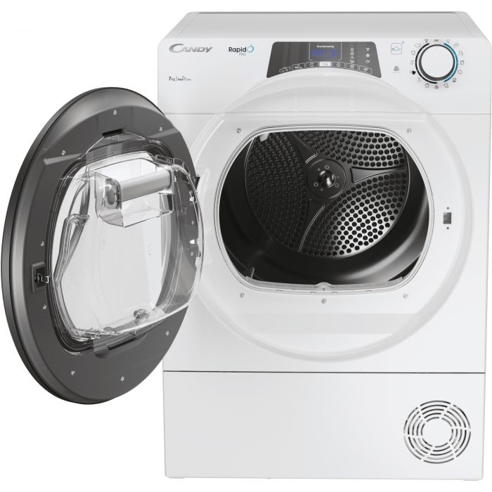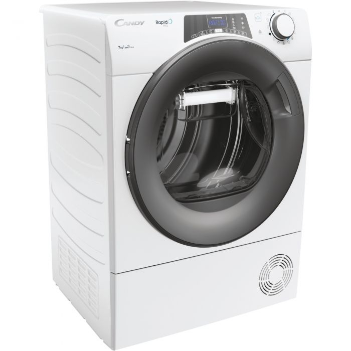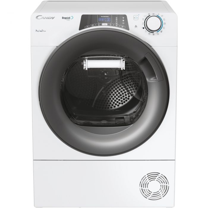Сушильная машина CANDY Rapido Pro RP4 H7A2TRE-S, класс A++, загрузка 7 кг, тепловой насос, подключение по Wi-Fi/приложению hOn, тонкий корпус, простой корпус, программы быстрой сушки, датчик сушки, детектор веса, белая/черная дверца
