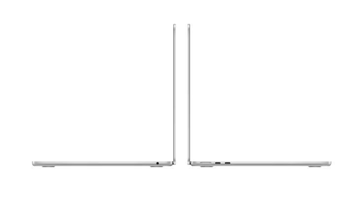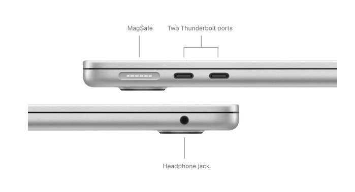 MacBook Air are doua porturi Thunderbolt, mufa pentru casti, Wi-Fi 6E, Bluetooth 5.3 si un port de incarcare MagSafe. Si conecteaza pana la doua monitoare externe cu capacul laptopului inchis.