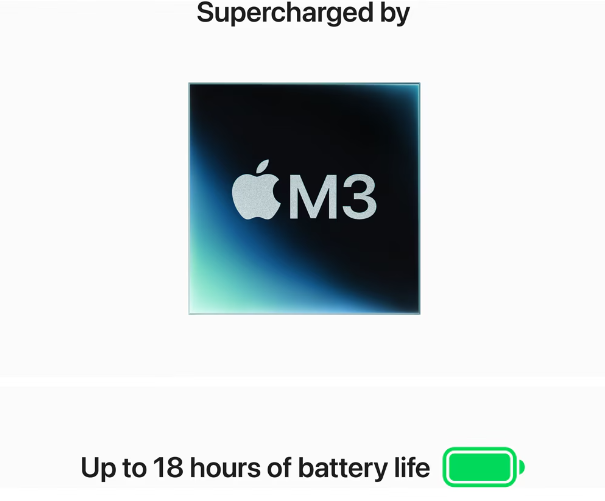 Puternicul cip Apple M3 cu un CPU cu 8 nuclee si un GPU cu 10 nuclee asigura o functionare fara probleme. Autonomie a bateriei uimitoare, pentru toata ziua, ca sa-ti poti lasa incarcatorul acasa.