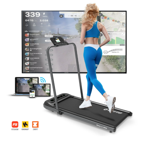 Bluetooth și Aplicații Avansate: Conectează-ți smartphone-ul sau tableta prin Bluetooth pentru a controla banda folosind aplicațiile FitShow/Kinomap și experimentează antrenamente virtuale captivante în lumea virtuală a aplicației Zwift.