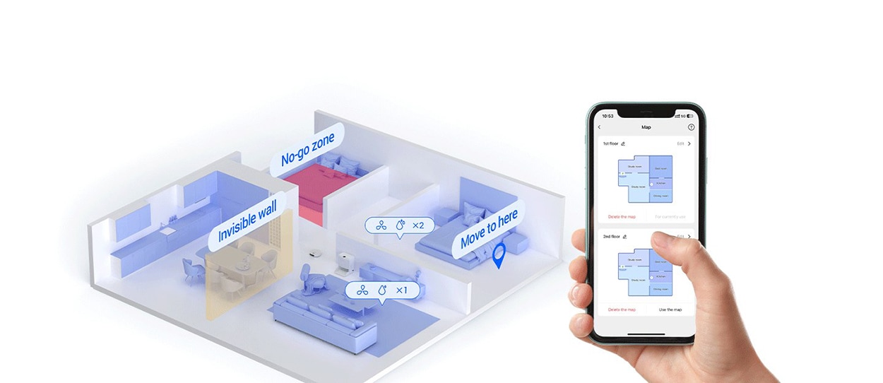 Tehnologia D-ToF Laser si camera RGB lucreaza impreuna pentru a crea o harta a casei tale. Apoi puteti ajusta harta si configura misiuni de curatare specifice pentru fiecare zona. Chiar si in casele mari, RS2 poate genera automat planuri de curatare pentru diferite etaje.